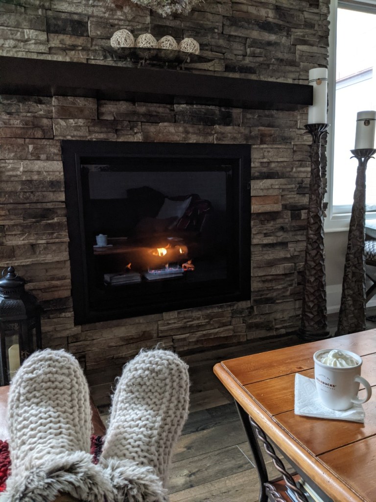 This is me on my comfy couch reading a book, enjoying my fireplace